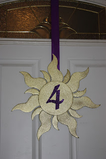 I made this door sign by cutting the Rapunzel sun out of foam core and then spraying it with gold glitter paint. I attached a glittery purple 4 and a purple ribbon and I had the perfect welcome to our Rapunzel party.